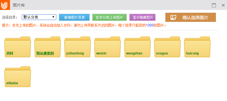 圖片庫是一個儲存圖片的網(wǎng)絡(luò)相冊,打開圖片庫頁面,首先新增圖片目錄,在目錄里面上傳圖片,建議根據(jù)產(chǎn)品或者服務(wù)分類產(chǎn)品目錄,每個目錄只能容納1000圖片,可以使用水印功能上傳帶水印的圖片使用。