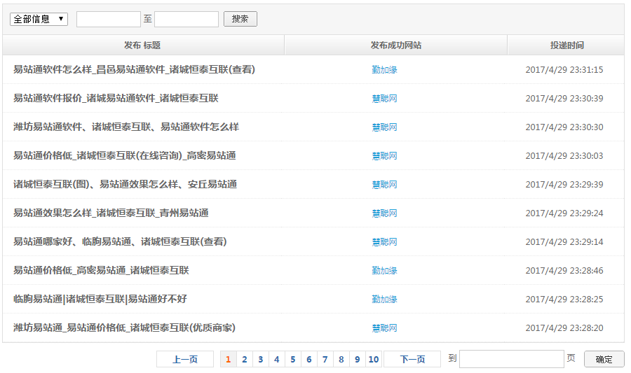 可查閱已發(fā)布成功信息的詳細情況:包括標題、網站、時間,點擊標題看查看發(fā)布情況。
