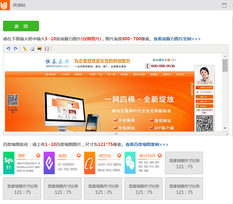 設(shè)置自動優(yōu)化:自動優(yōu)化讀取“商機(jī)行業(yè)匹配”分組,英雄帖自動優(yōu)化是以商機(jī)行業(yè)匹配分組進(jìn)行優(yōu)化。優(yōu)化限圖片插入,不可插入文字,會影響已有排名,可以說服力圖片范例進(jìn)行優(yōu)化圖片再上傳優(yōu)化。設(shè)置成功,自動針對分組商機(jī)信息自動插入5~10張優(yōu)化圖片和優(yōu)化過的百度縮略圖,頁面美觀,大大提升流量轉(zhuǎn)化率。